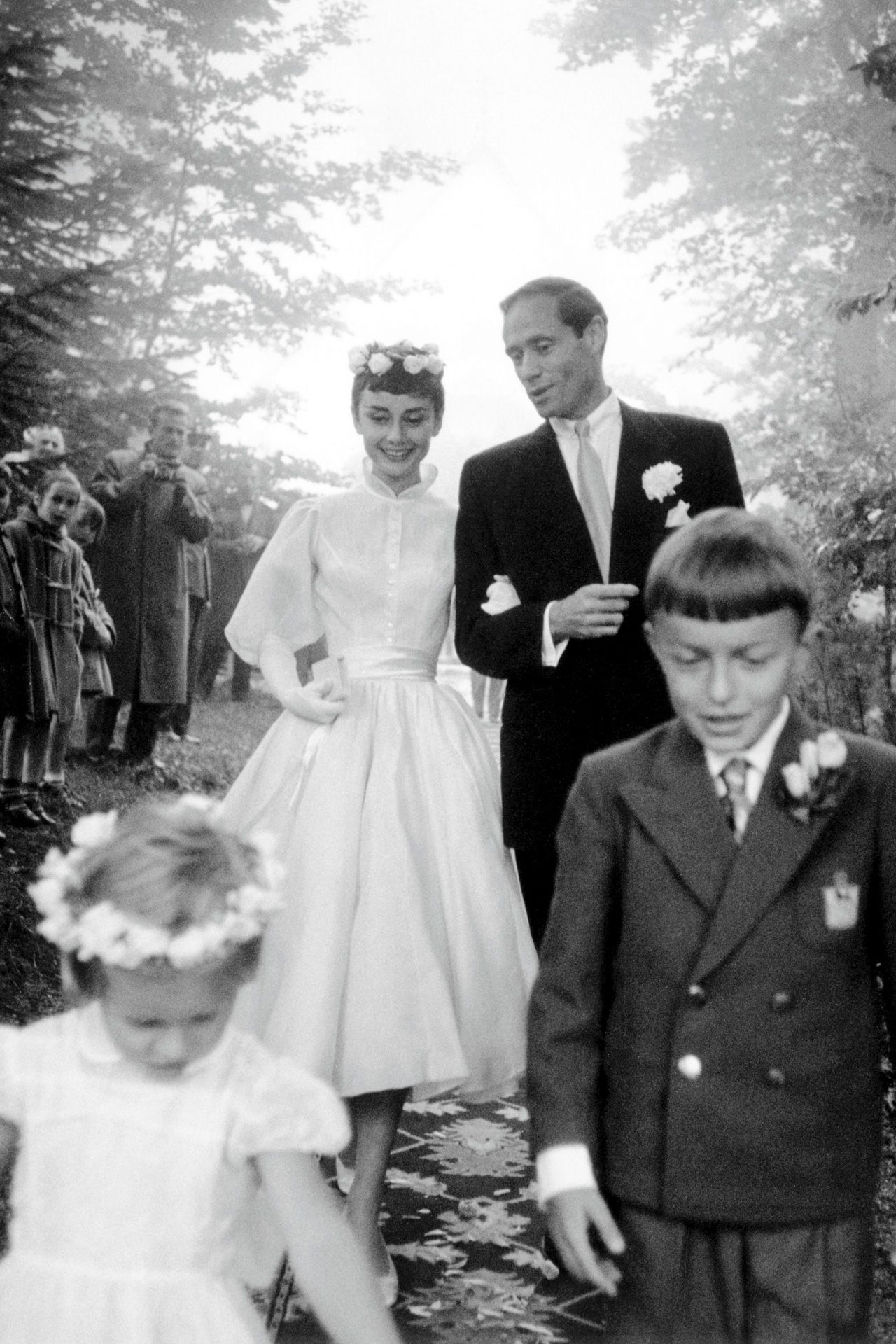 Mở đầu danh sách này chính là chiếc váy cưới tinh tế và sang trọng mà Pierre Balmain dành tặng cho "Nàng thơ tạo nên định nghĩa của sự thanh lịch" - Audrey Hepburn trong lễ thành hôn với diễn viên Mel Ferrer tại Thụy Sĩ năm 1954.