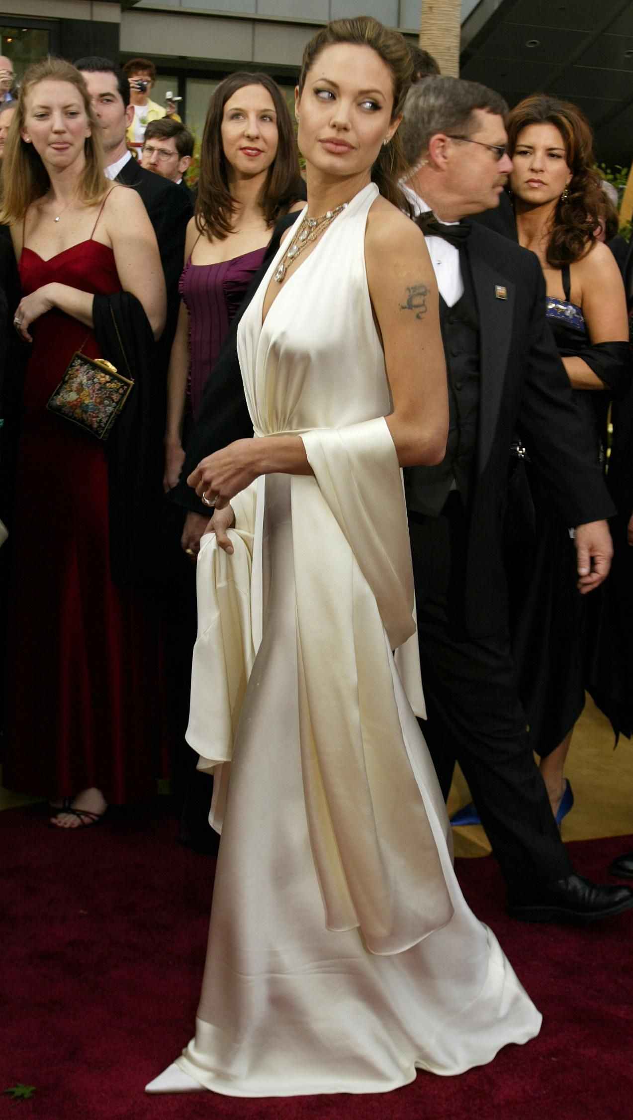 Angelina Jolie lộng lẫy trên thảm đỏ lễ trao giải Oscar 2004 trong bộ đầm lụa trắng xẻ sâu quyến rũ của Marc Bouwer, giúp nữ diễn viên phô diễn vóc dáng đáng ngưỡng mộ.