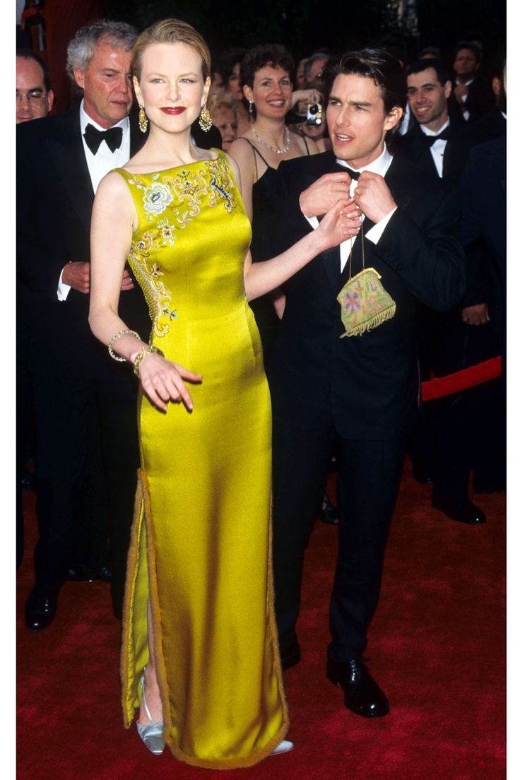 Chiếc váy vàng nổi bật của Christian Dior đã giúp "thiên nga nước Úc" Nicole Kidman tỏa sáng tuyệt đối tại lễ trao giải Oscar năm 1997, với họa tiết hoa thêu nhấn nhá nơi cổ áo cùng dáng váy xẻ quyến rũ, sang trọng. Tính theo tỷ giá lạm phát thì đây chính là chiếc váy đắt giá nhất trong lịch sử Oscar với trị giá 2 triệu USD lúc bấy giờ.