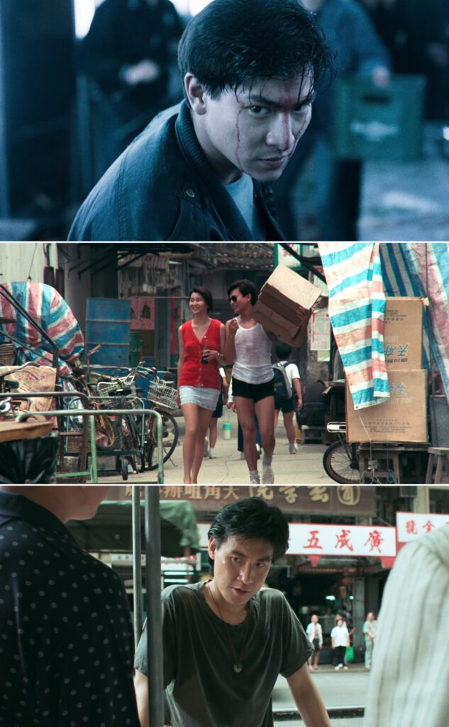 Các cảnh quay ban đêm trong phim thường sử dụng ánh sáng neon xanh, đỏ, và vàng từ các bảng hiệu, đèn đường, và quán ăn để tạo nên một không khí đô thị đặc trưng. Ví dụ, cảnh Hoa (Lưu Đức Hoa) đi bộ qua những con hẻm tối tăm của Vượng Giác, ánh sáng neon chiếu lên khuôn mặt anh, vừa làm nổi bật vẻ ngoài nam tính, vừa gợi lên sự cô đơn và lạc lõng. Tông màu xanh lạnh lẽo thường xuất hiện trong các cảnh giang hồ, biểu thị sự khắc nghiệt và nguy hiểm, trong khi tông đỏ ấm áp được sử dụng trong các khoảnh khắc giữa Hoa và Nga gợi lên sự gần gũi và lãng mạn. Hay khoảnh khắc Thiên Vương họ Lưu đeo kính ngồi trên chuyến xe bus quay lại khu Vượng Giác trong ánh sáng đầy mờ ảo đã trở thành một trong những hình ảnh kinh điển nhất của điện ảnh xứ Cảng Thơm.